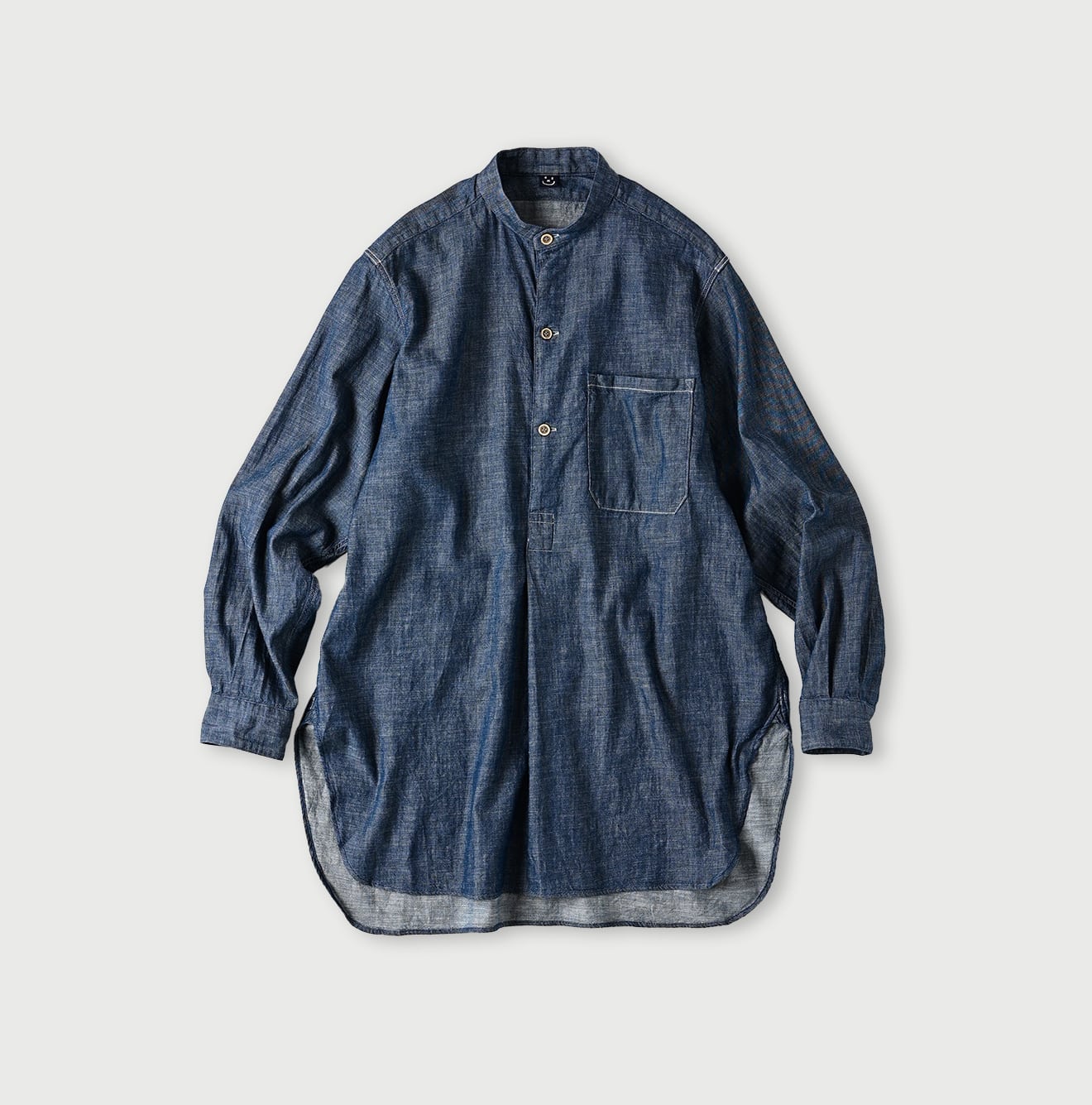 瑠璃ダンガリーデニムの908スタンドグランパプルシャツ(濃)