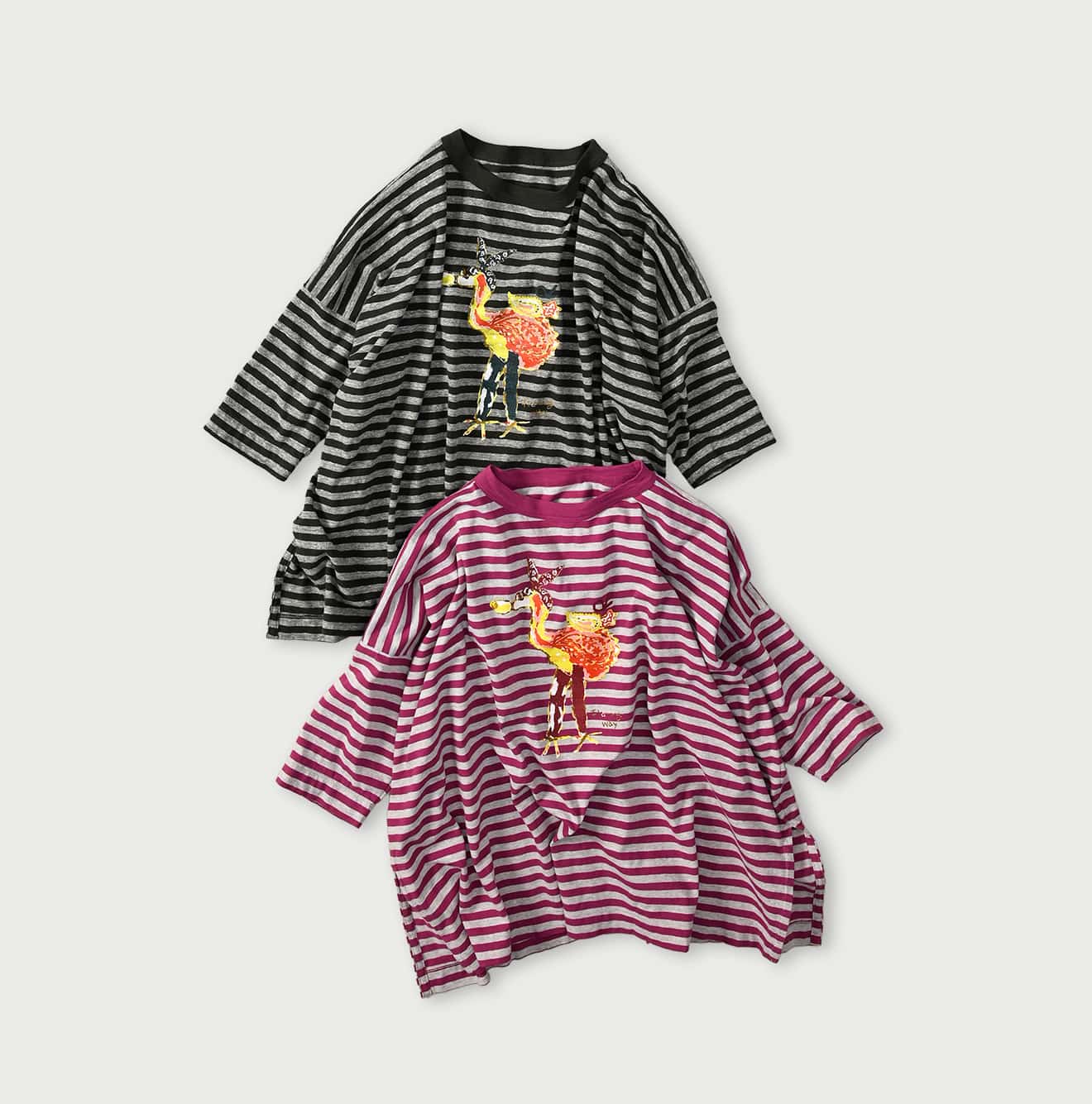 ボーダー天竺フラミングウェイプリントのビッグスリットTシャツ(トップ)