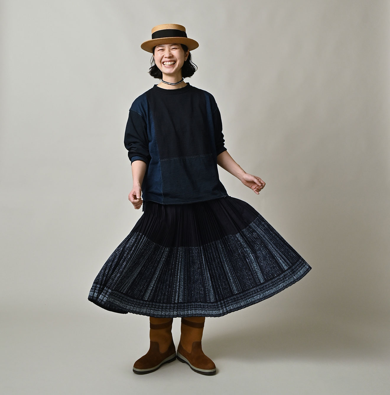 インディゴ抜染葵更紗プリントサテン×プリーツのスカート